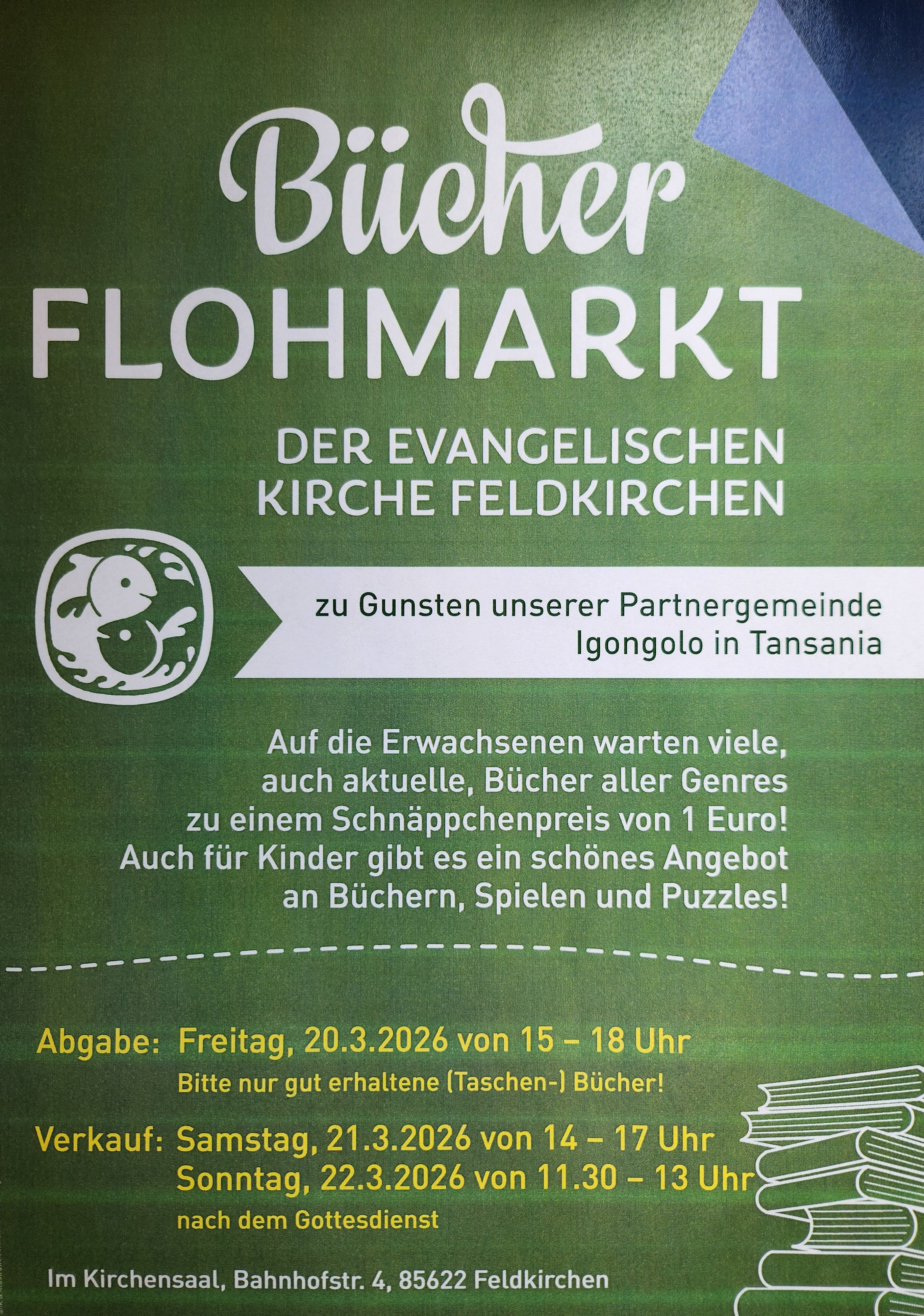 … zugunsten unserer Partnergemeinde Igongolo. Genießen Sie bei Kaffee und Kuchen (zugunsten der eigenen Gemeinde) das Stöbern in Stapeln gut erhaltener und aktueller (Taschen)bücher, bei den Kinder-CD´s u.v.m. …